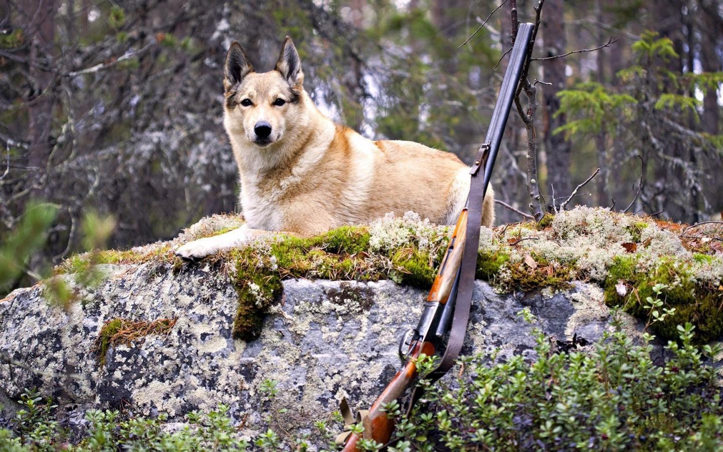 Охотничья собака и ружье, сделанное в лесу обои для рабочего стола, картинки, фото, 1440x900. | |||||||||||||||||