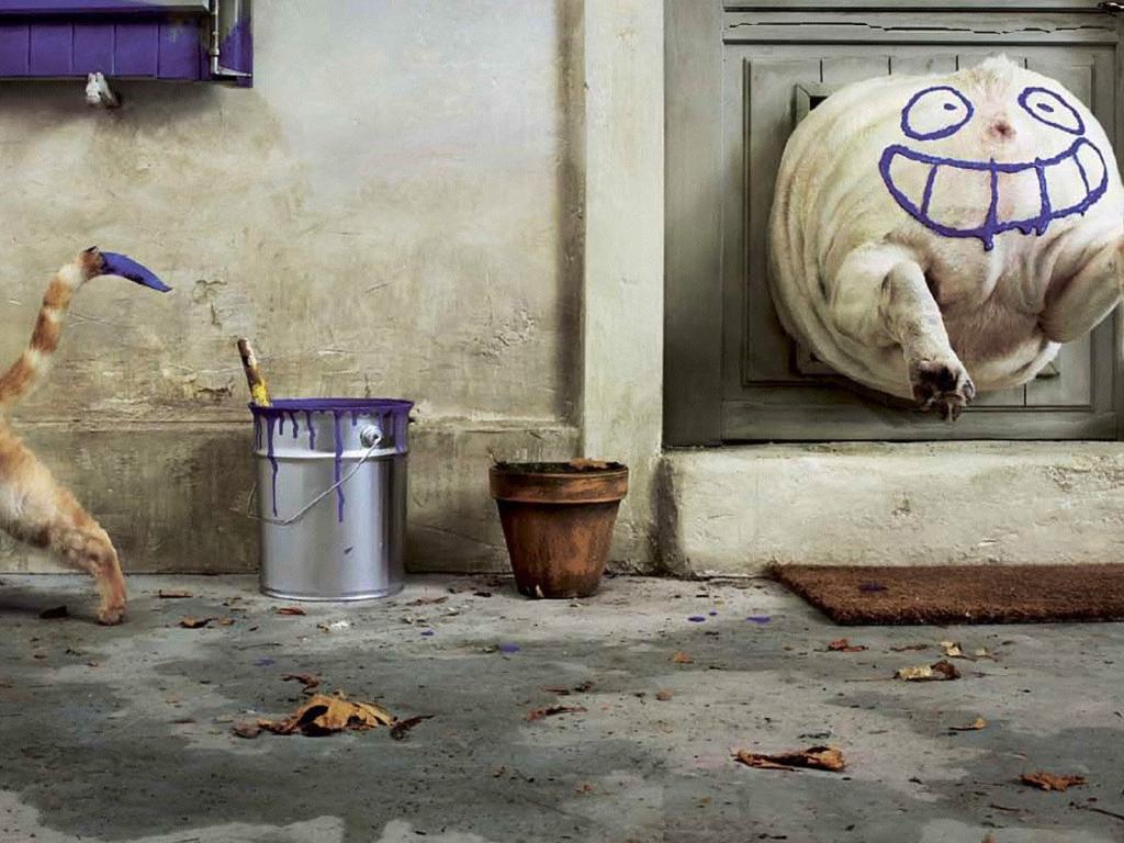 Кот, собака, юмор, краска, дверь обои для рабочего стола, картинки, фото, 1024x768. | ||||||||||||||||