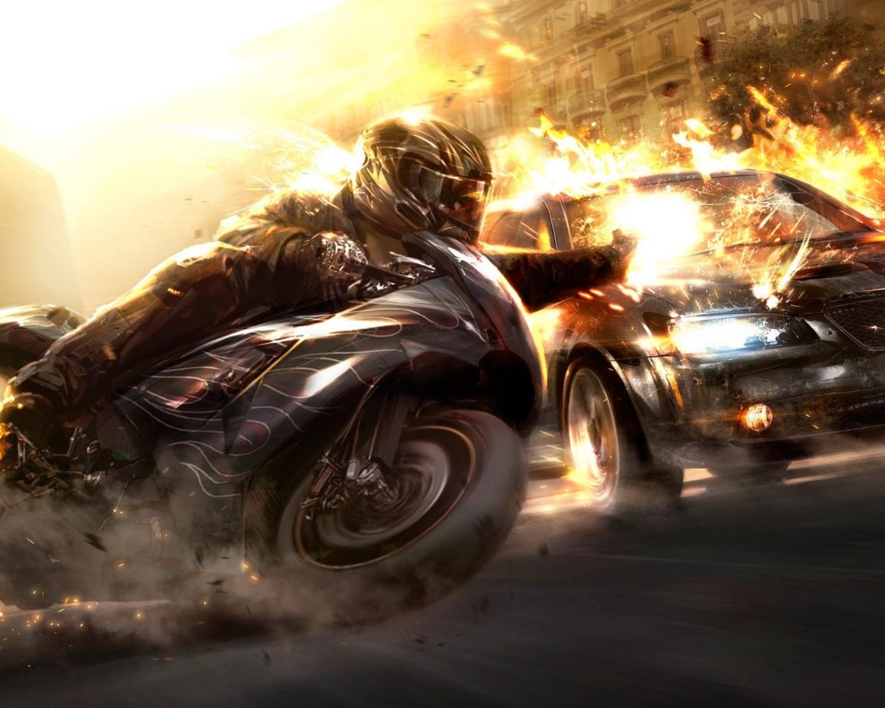 Погоня, мотоцикл, авто, огонь, взрывы обои для рабочего стола, картинки, фото, 1280x1024. | |||||||||||||||||