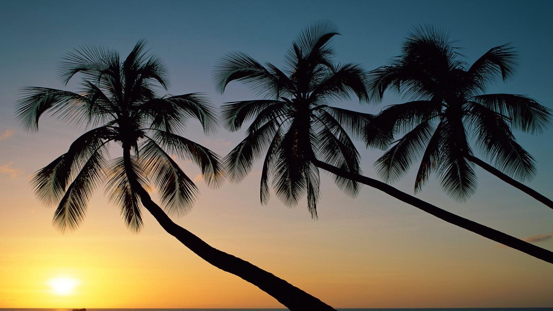 Три пальмы и солнце над водой обои для рабочего стола, картинки, фото, 1920x1080. | ||||||||||||||||