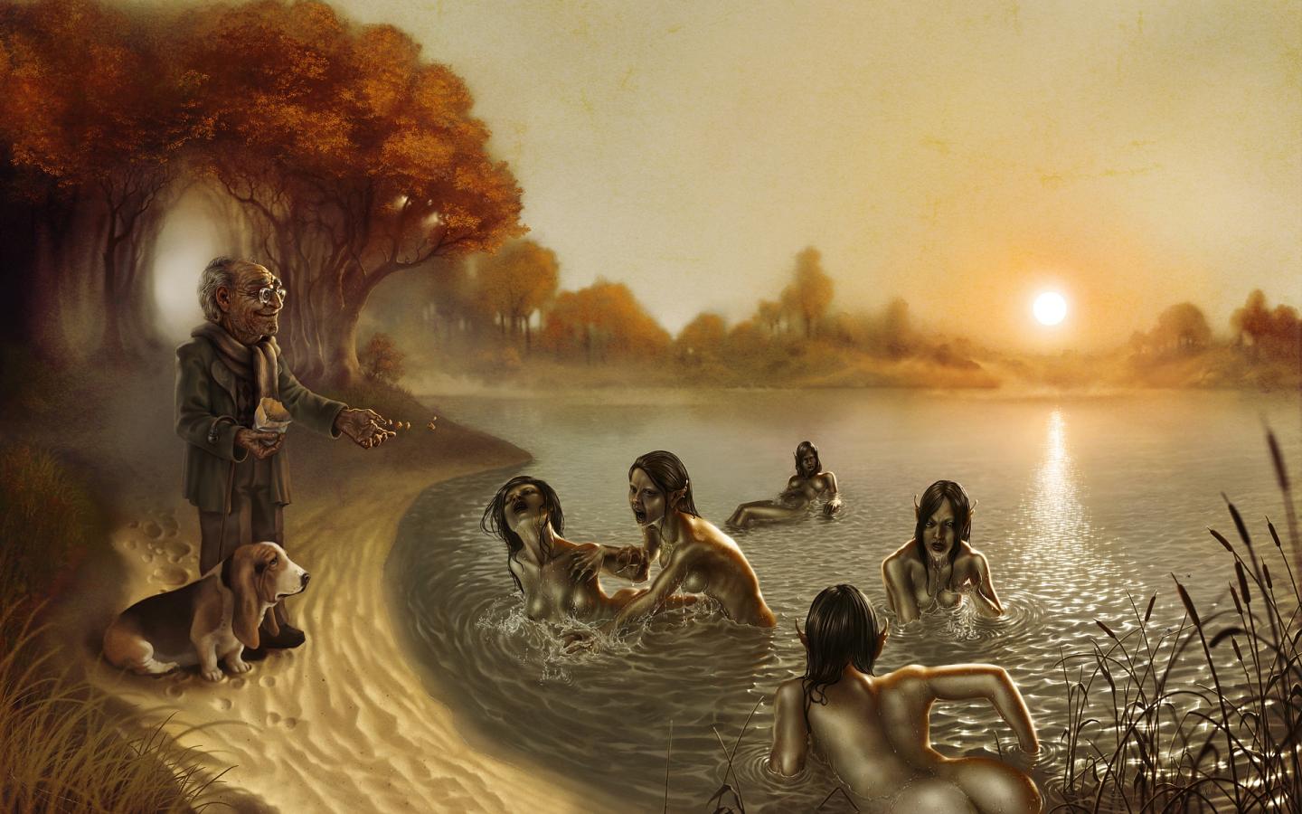 Дедушка прикармливает плавунов обои для рабочего стола, картинки, фото, 1440x900. | ||||||||||||||||