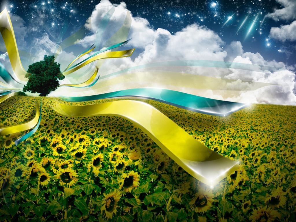 Дерево, ленты, подсолнечники, звёзды, облака обои для рабочего стола, картинки, фото, 1024x768. | ||||||||||||||||
