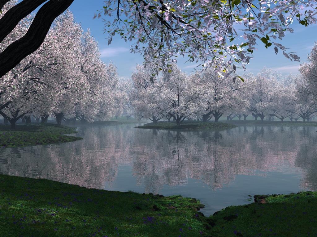 Природа, озеро, трава, деревья, цветущие, весна, дымка, цветы обои для рабочего стола, картинки, фото, 1024x768. | ||||||||||||||||