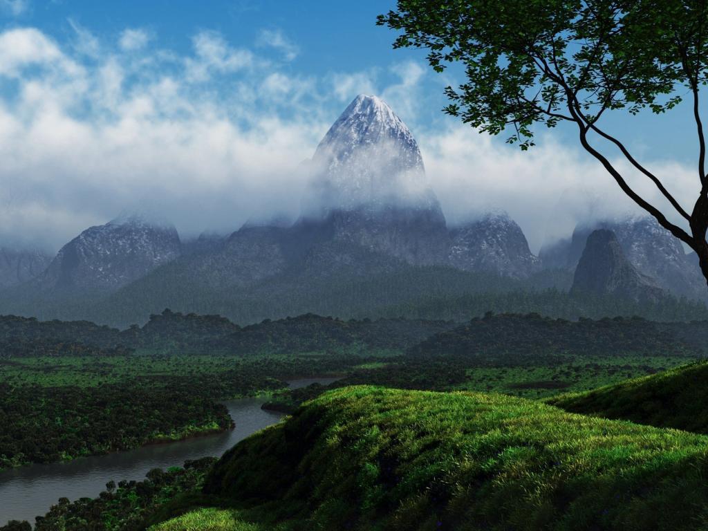 Природа, гора, деревья, река, зелень, облака, холмы обои для рабочего стола, картинки, фото, 1024x768. | ||||||||||||||||