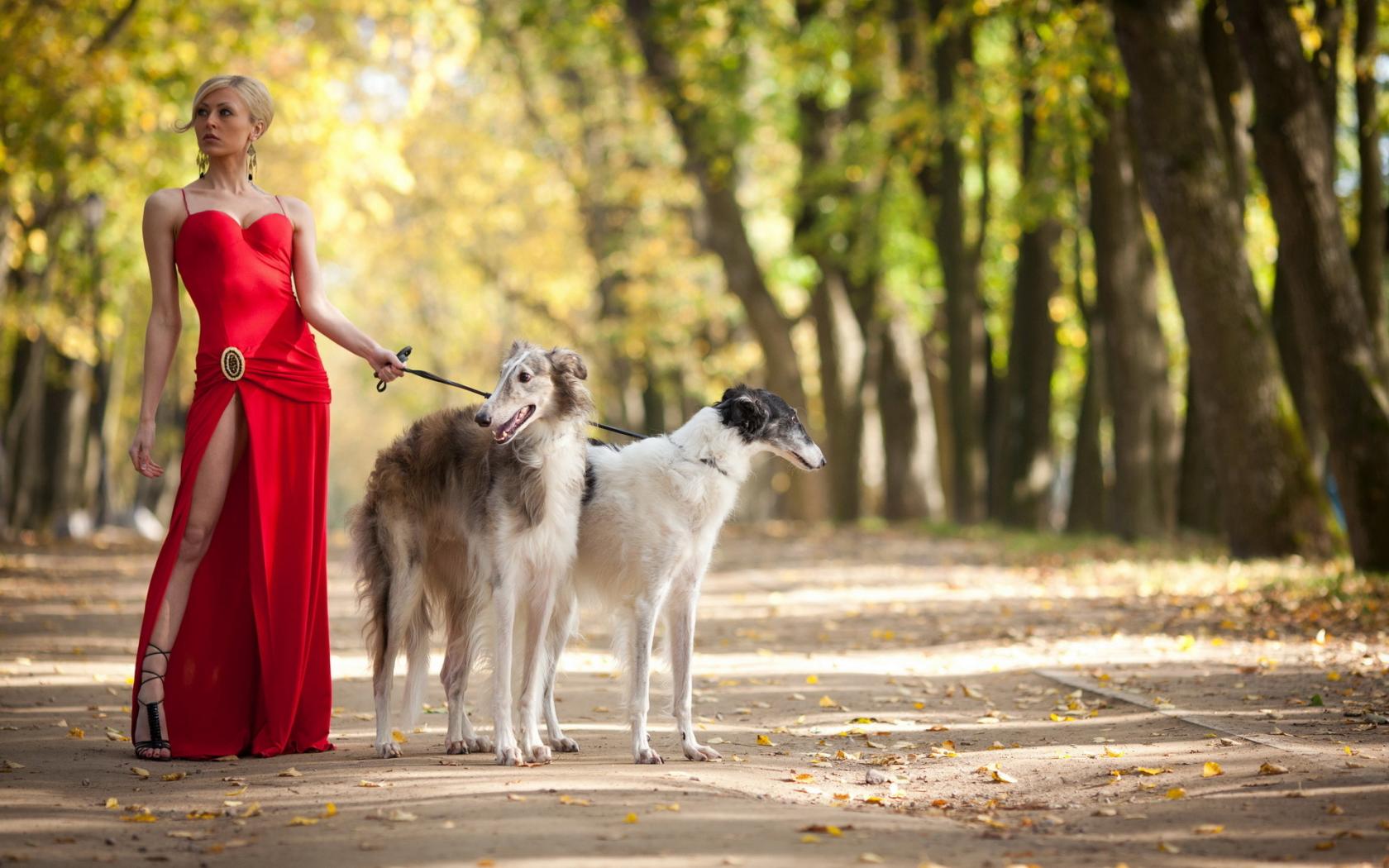 Девушка в красном платье с двумя собаками (борзыми) обои для рабочего стола, картинки, фото, 1680x1050. | ||||||||||||||||||||||