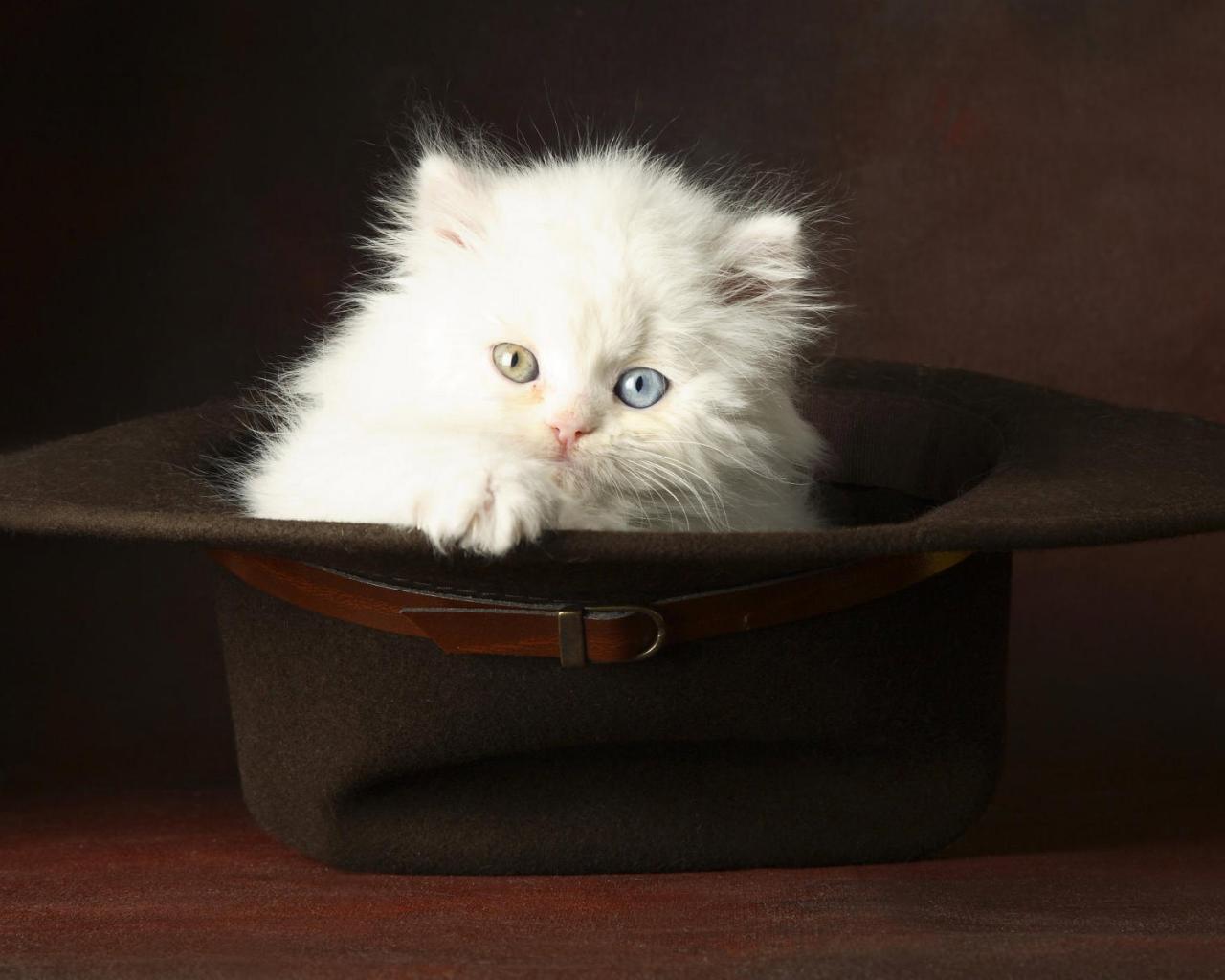 Котенок, белый, пушистый, шляпа, глаза обои для рабочего стола, картинки, фото, 1280x1024. | ||||||||||||||||