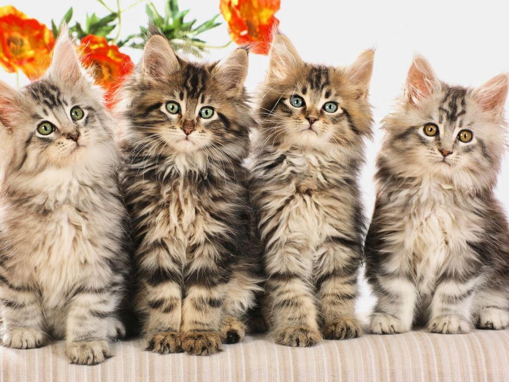 Котята, полосатые, пушистые, квартет, цветок обои для рабочего стола, картинки, фото, 1024x768. | ||||||||||||||||||||||