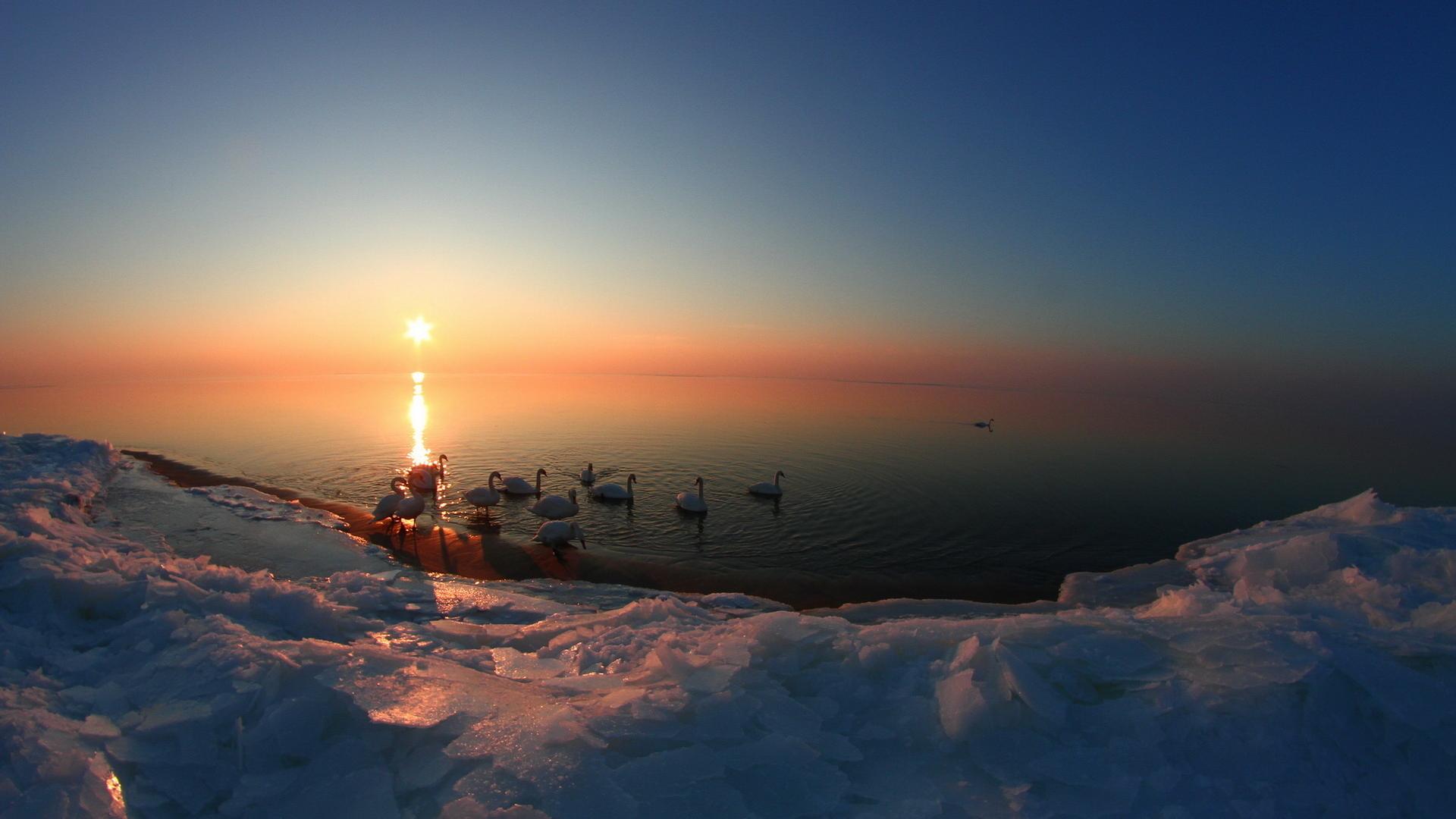 Лебеди, лёд, озеро, закат обои для рабочего стола, картинки, фото, 1920x1080. | ||||||||||||||||