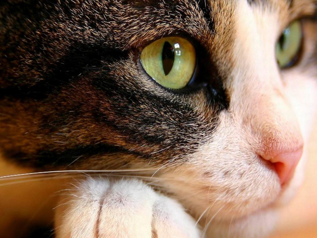 Животное, кот, кошка, зеленые, глаза, нос, морда, лапа, лежа, макро обои для рабочего стола, картинки, фото, 1024x768. | ||||||||||||||||