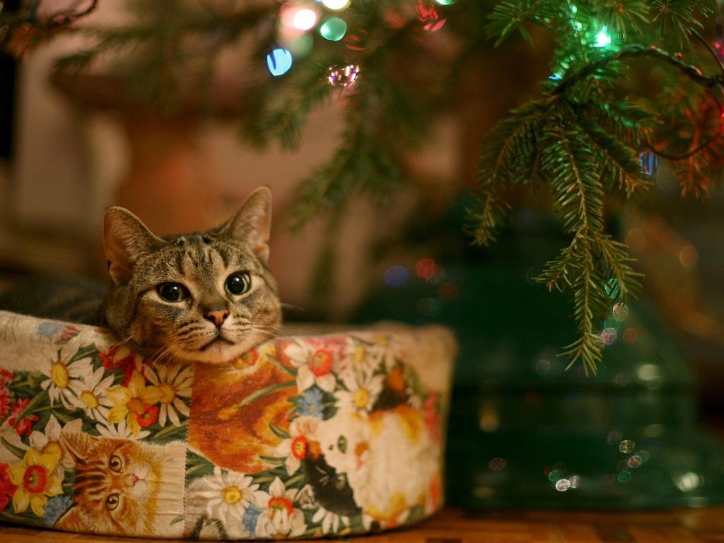 Кошка, елка, новый год, подарок обои для рабочего стола, картинки, фото, 1024x768. | ||||||||||||||||