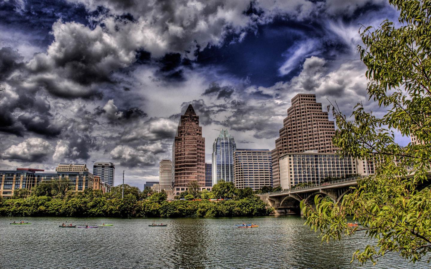 Высотные здания, река, лодки, мост, дерево, тучи обои для рабочего стола, картинки, фото, 1440x900. | ||||||||||||||||