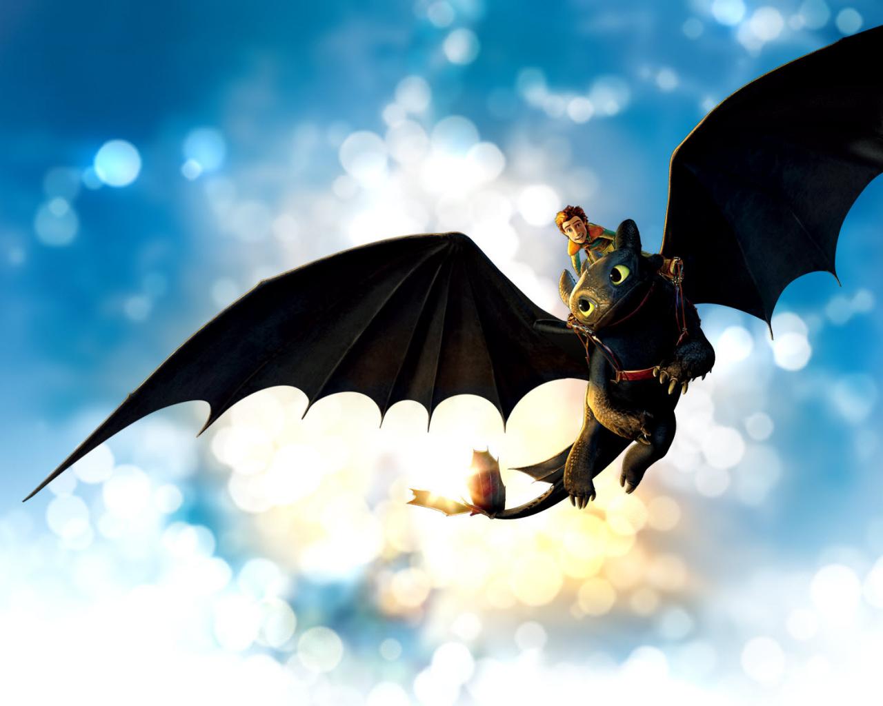 Как приручить дракона, дракон, иккинг, беззубик, ночная фурия, полёт, небо, свет, блики, синева обои для рабочего стола, картинки, фото, 1280x1024. | ||||||||||||||||