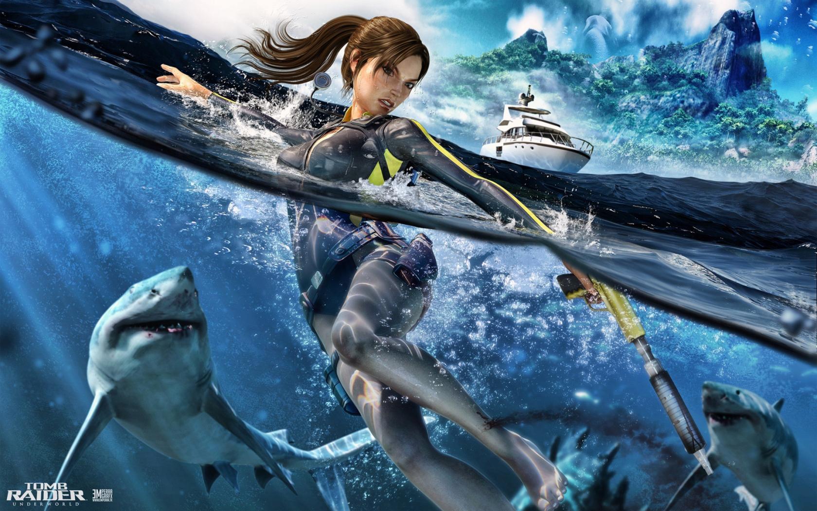 Лара Крофт против акул обои для рабочего стола, картинки, фото, 1680x1050. | ||||||||||||||||