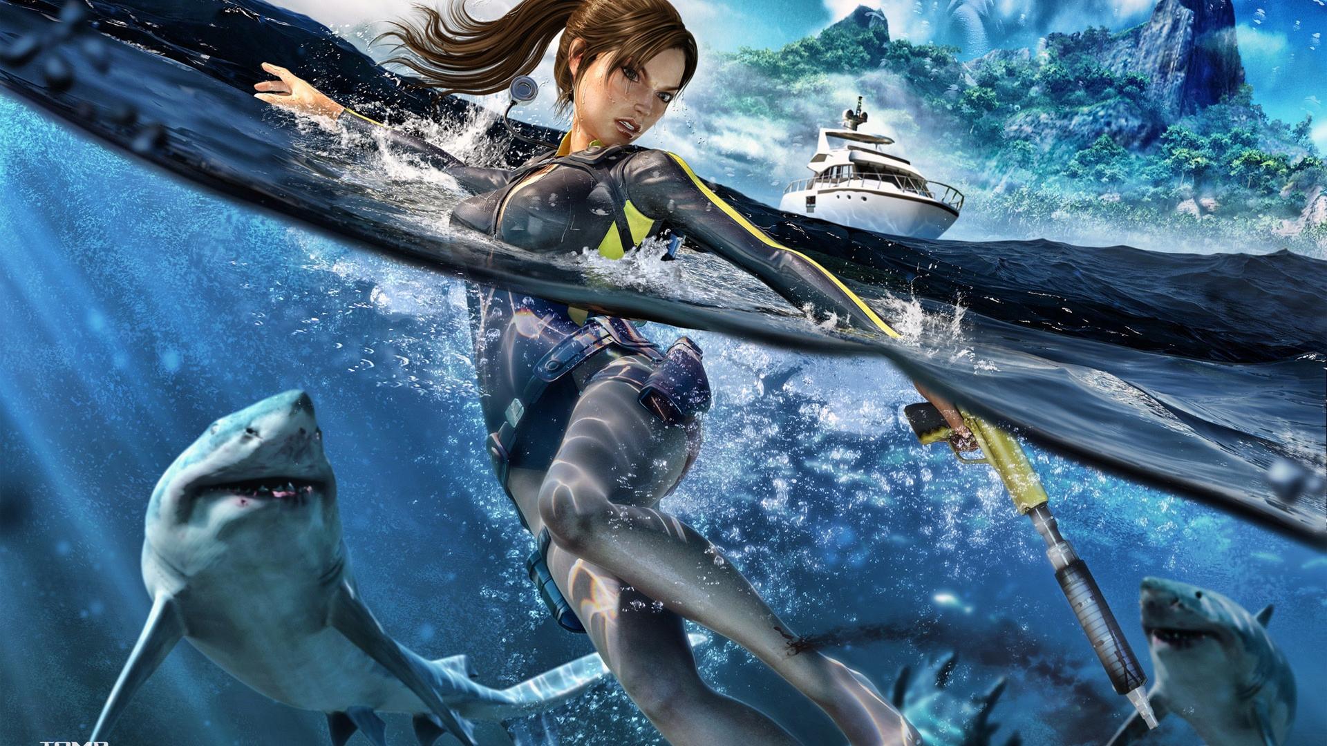 Лара Крофт против акул обои для рабочего стола, картинки, фото, 1920x1080. | ||||||||||||||||