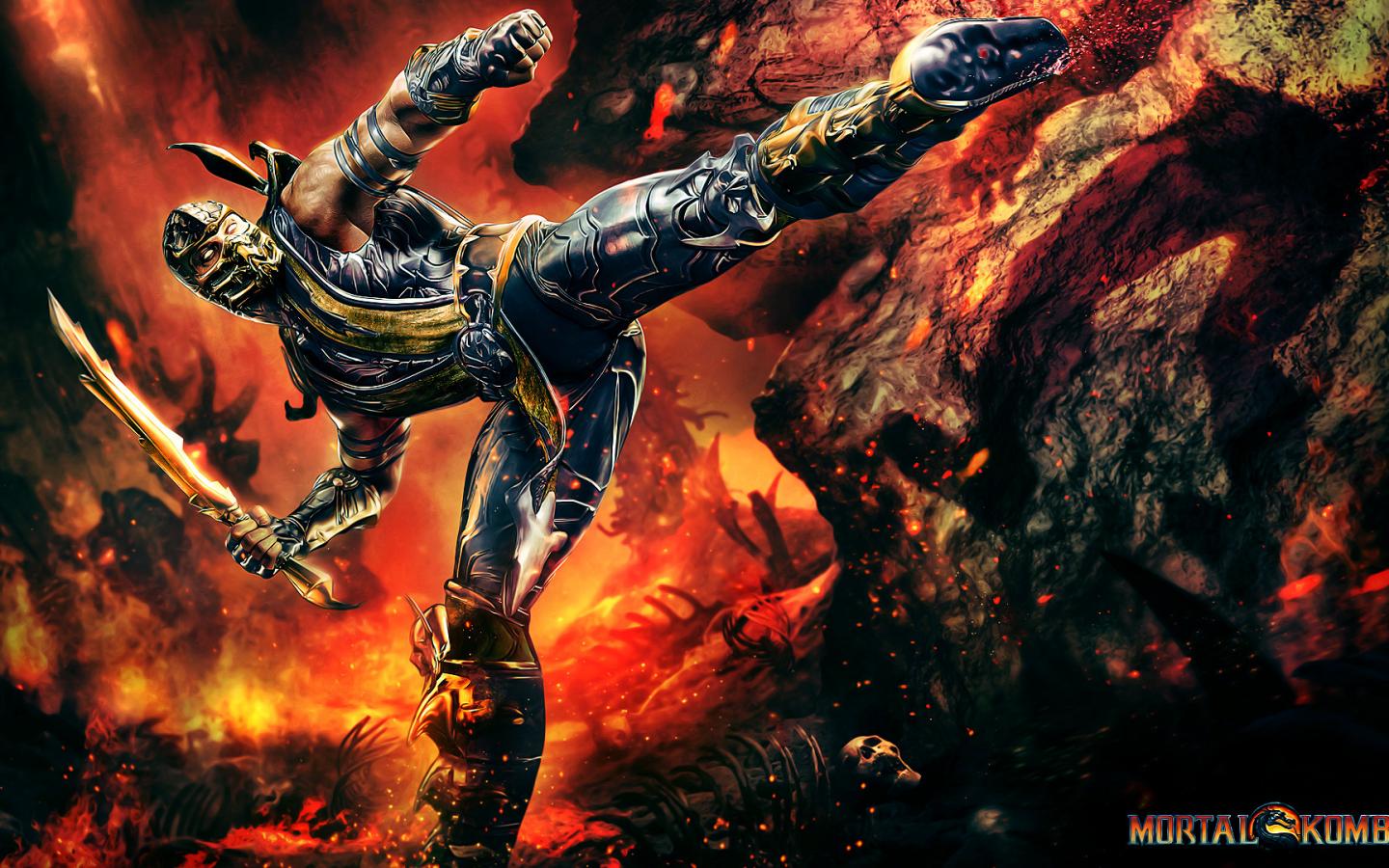 Mortal kombat, scorpion, огонь, меч обои для рабочего стола, картинки, фото, 1440x900. | ||||||||||||||||