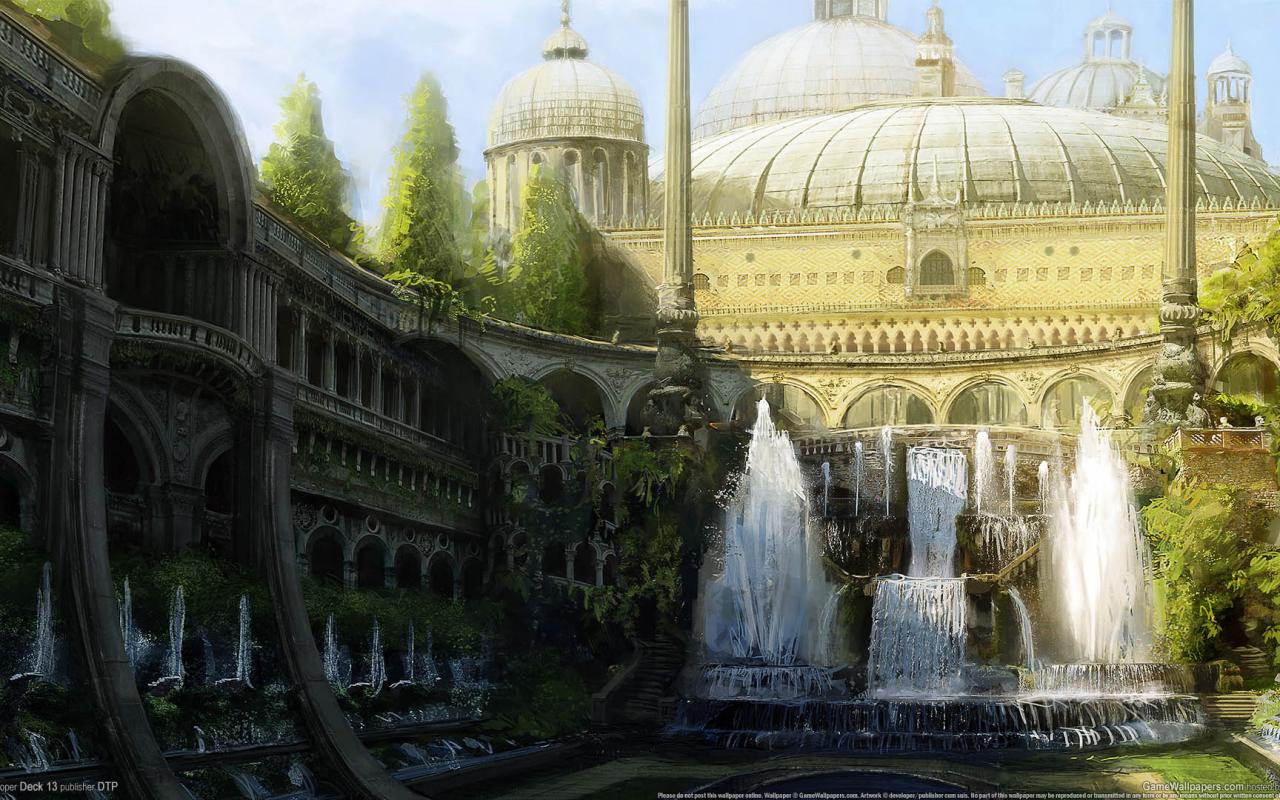 Арт, город, купола, фонтаны, шпили, деревья, парк, арки, акведук, колонны обои для рабочего стола, картинки, фото, 1280x800. | ||||||||||||||||||||||