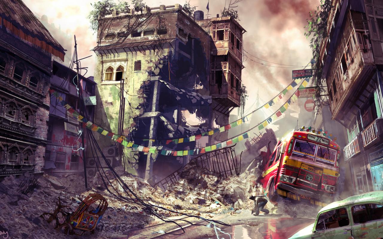 Арт, город, разруха, автобус, квартал, война обои для рабочего стола, картинки, фото, 1280x800. | ||||||||||||||||