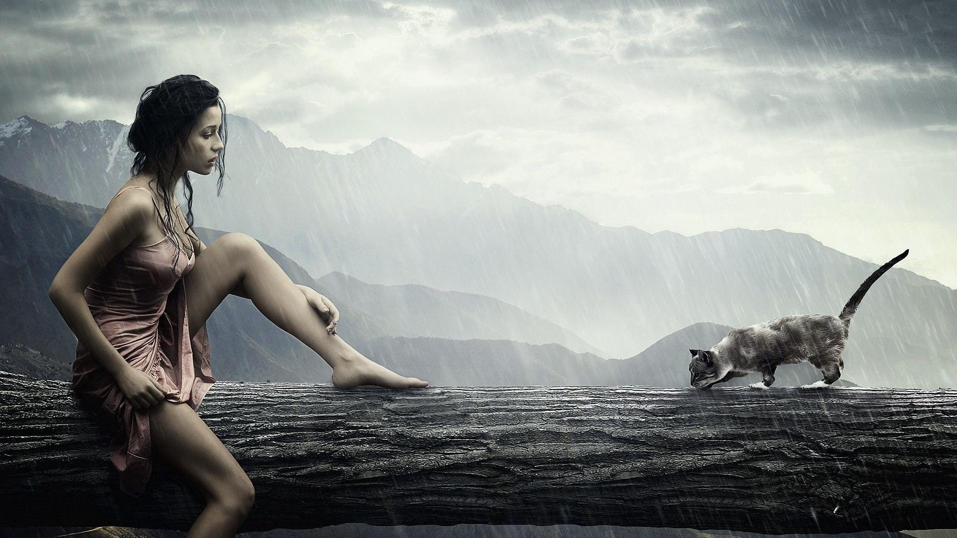 Девушка с кошкой на бревне обои для рабочего стола, картинки, фото, 1920x1080. | ||||||||||||||||