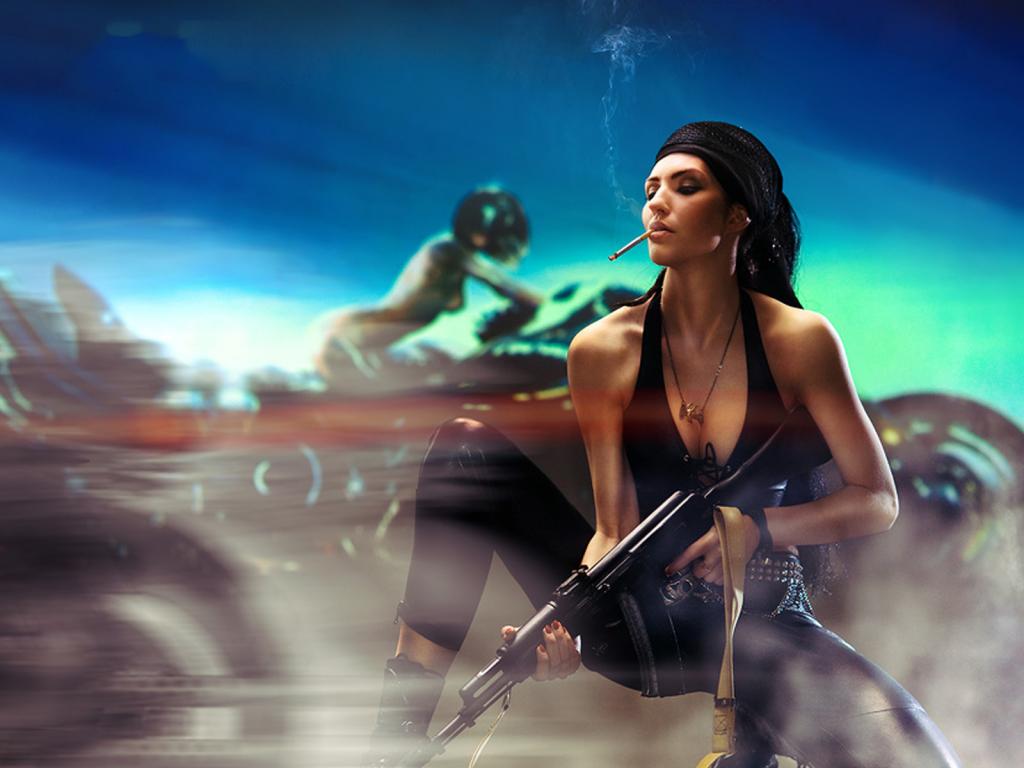 Девушки, автомат, мотоцикл обои для рабочего стола, картинки, фото, 1024x768. | ||||||||||||||||