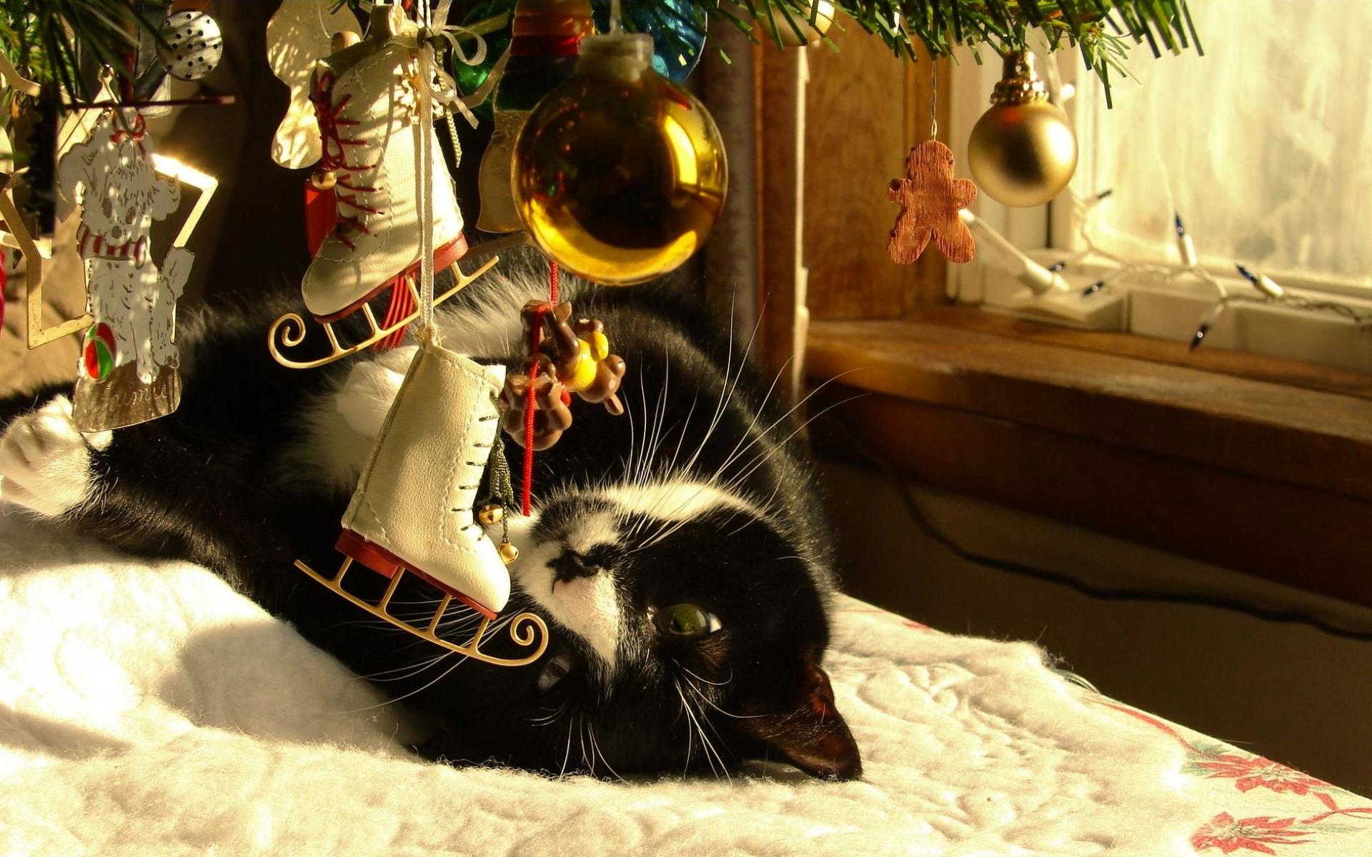 Кошка и елка обои для рабочего стола, картинки, фото, 1920x1200. | ||||||||||||||