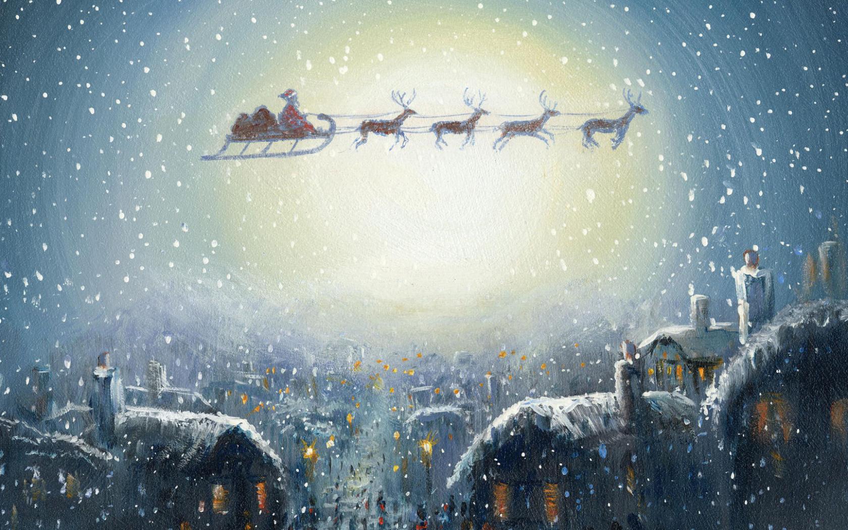 Праздник, рождество, сочельник, город, домики, окна, огни, снег, сани, упряжка, олени, дед мороз, сп обои для рабочего стола, картинки, фото, 1680x1050. | ||||||||||||||||
