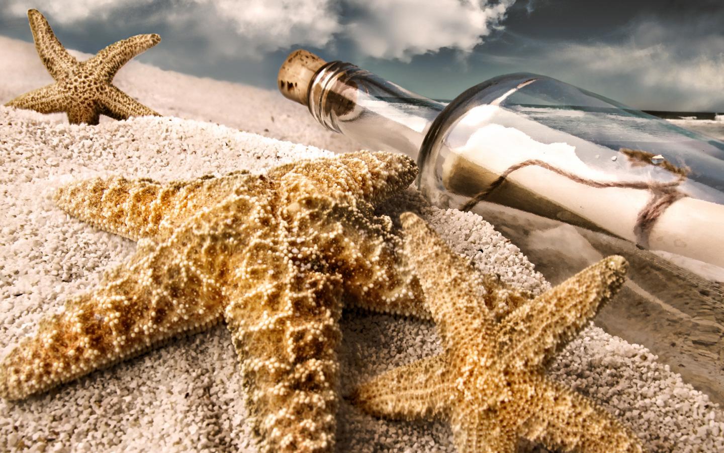 Пляж, песок, звёзды, бутылка, записка обои для рабочего стола, картинки, фото, 1440x900. | ||||||||||||||||