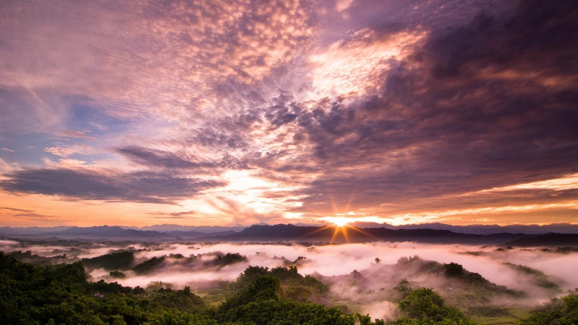 Лес, туман, солнце, закат, облака обои для рабочего стола, картинки, фото, 1920x1080. | ||||||||||||||||