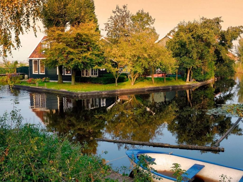 Дома, пруд, лодки, деревья, остров обои для рабочего стола, картинки, фото, 1024x768. | ||||||||||||||||