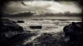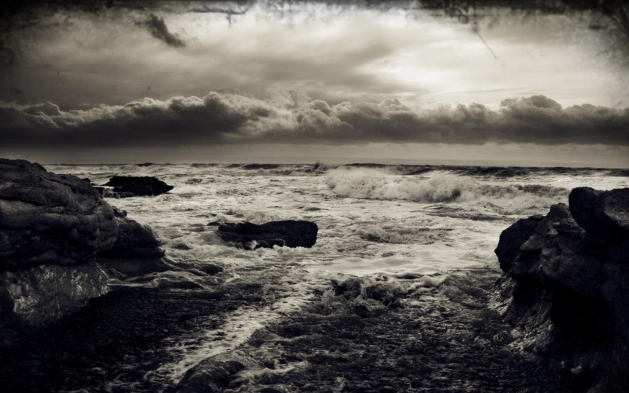 Природа, пейзаж. море, шторм, ветер, волны, морская, пена, камни, тучи, чёрн-белое обои для рабочего стола, картинки, фото, 1280x800. | ||||||||||||||||