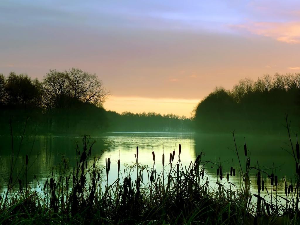 Камыши, озеро, лес, дымка обои для рабочего стола, картинки, фото, 1024x768. | ||||||||||||||||