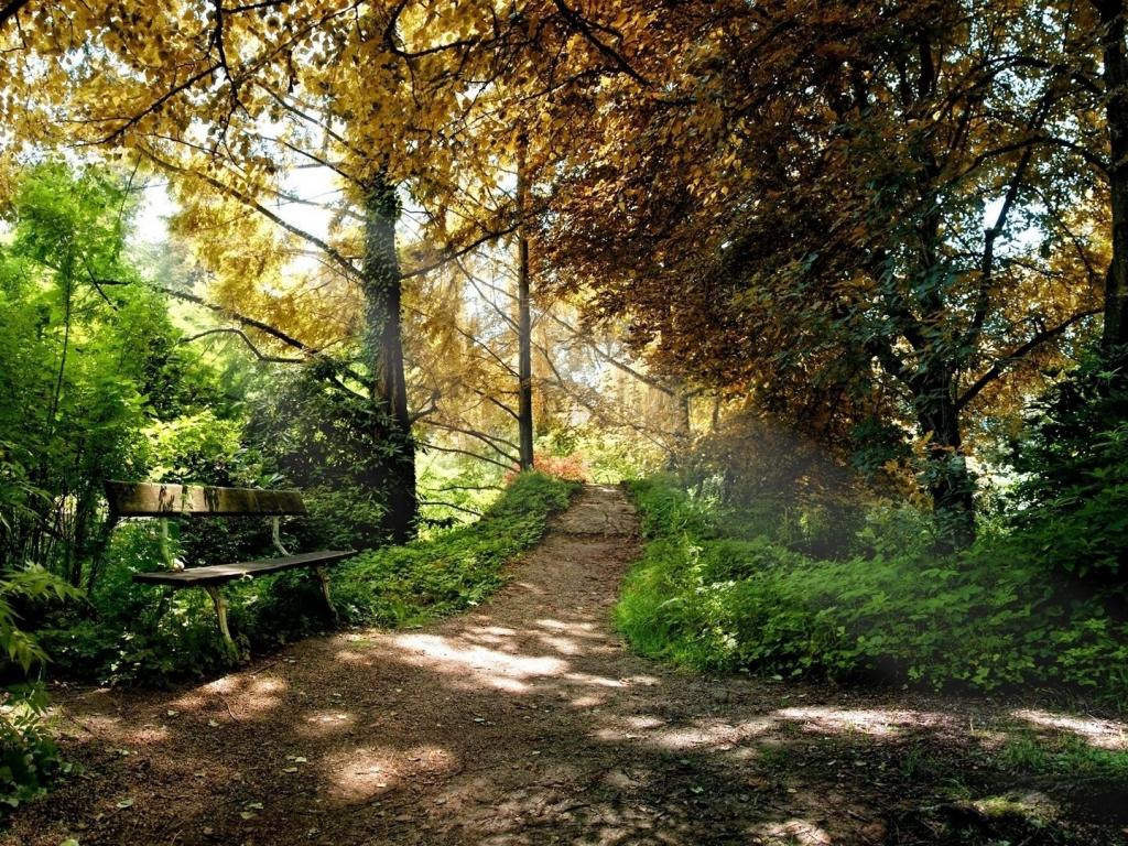 Лес, парк, тропинка, скамейка, деревья, лучи обои для рабочего стола, картинки, фото, 1024x768. | ||||||||||||||||