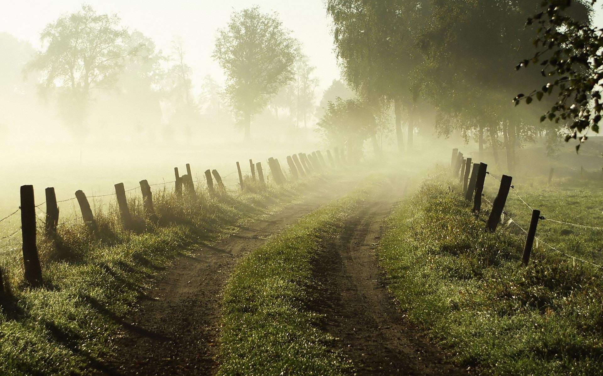 Утро, рассвет, туман, дорога, трава, ограда, забор, деревья, природа обои для рабочего стола, картинки, фото, 1920x1200. | ||||||||||||||||