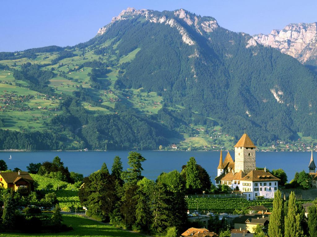 Гора, домики, озеро обои для рабочего стола, картинки, фото, 1024x768. | ||||||||||||||||