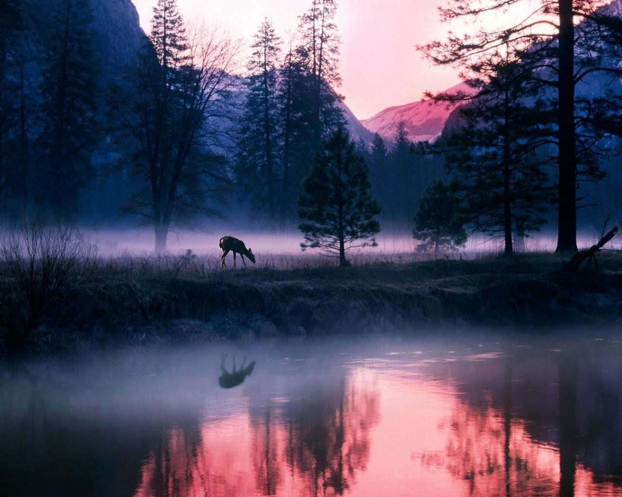 Лес, озеро, олень, горы туман обои для рабочего стола, картинки, фото, 1280x1024. | ||||||||||||||||