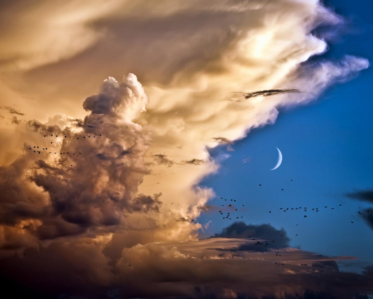 Природа, красоты, небо, облака, птицы, месяц обои для рабочего стола, картинки, фото, 1280x1024. | ||||||||||||||||||||||