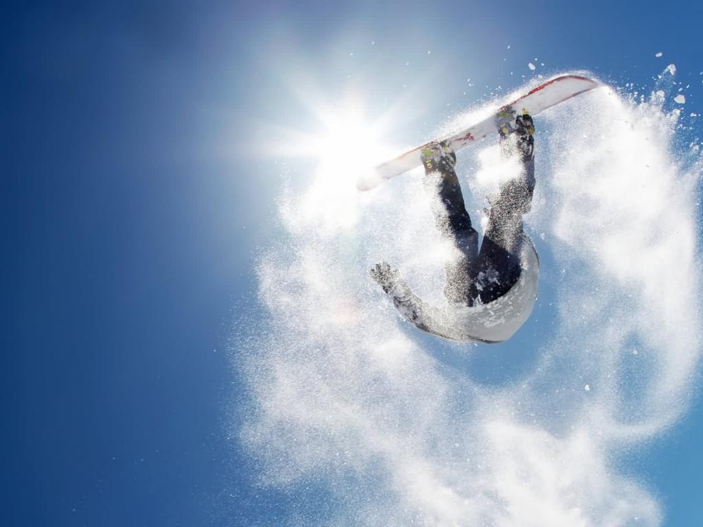 Сноубордист застыл в воздухе на фоне голубое небо, обои для рабочего стола, картинки, фото, 1024x768. | ||||||||||||||||