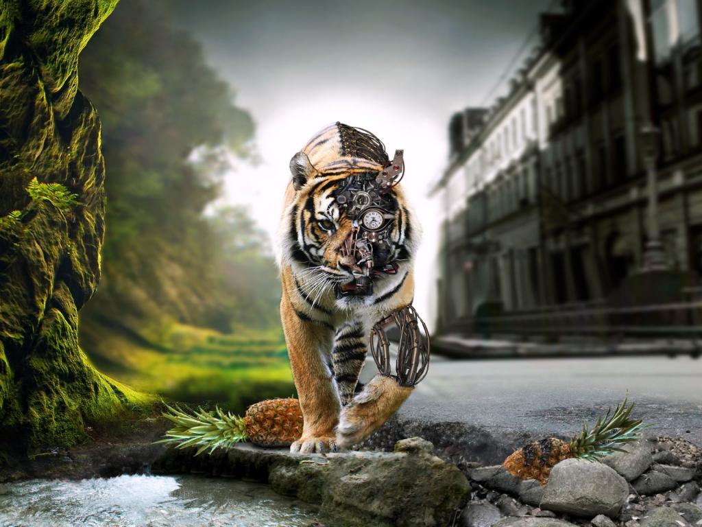 Тигр-робот обои для рабочего стола, картинки, фото, 1024x768. | ||||||||||||||