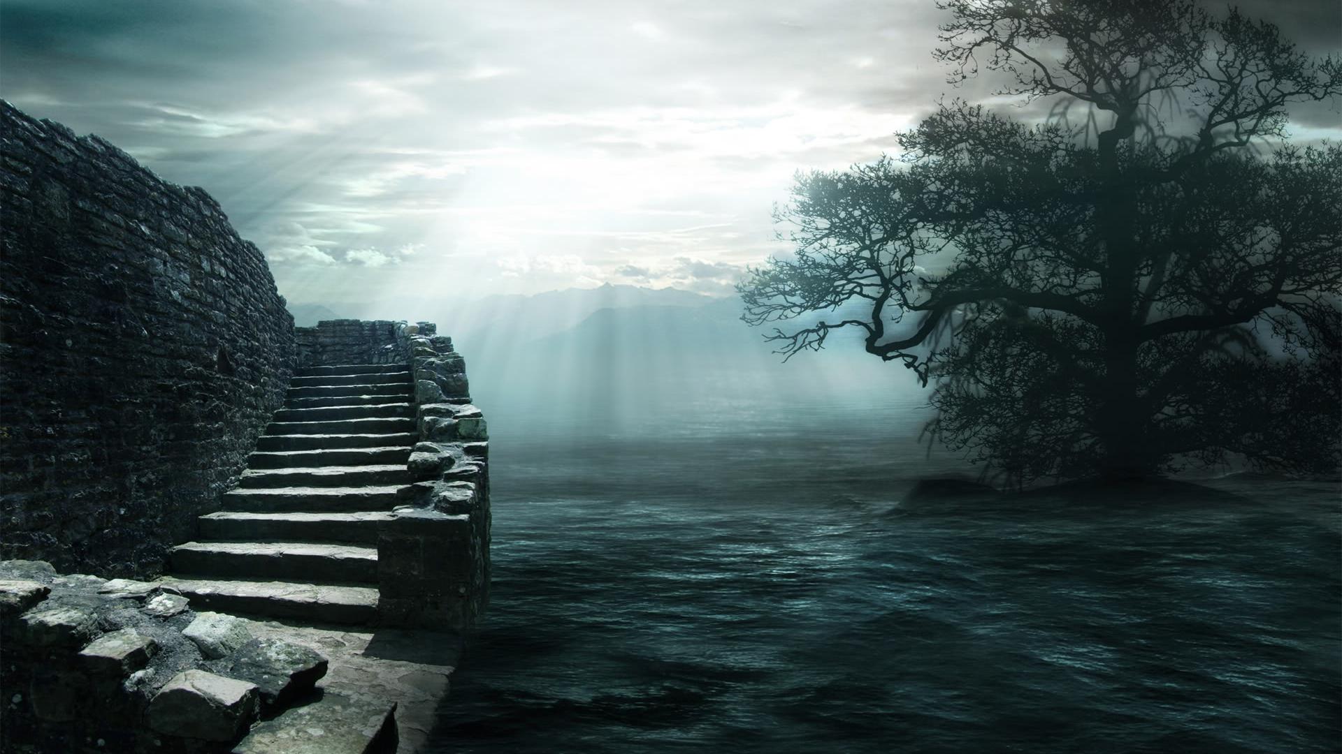Вода, лестница, камни, дерево, свет, облака обои для рабочего стола, картинки, фото, 1920x1080. | ||||||||||||||||
