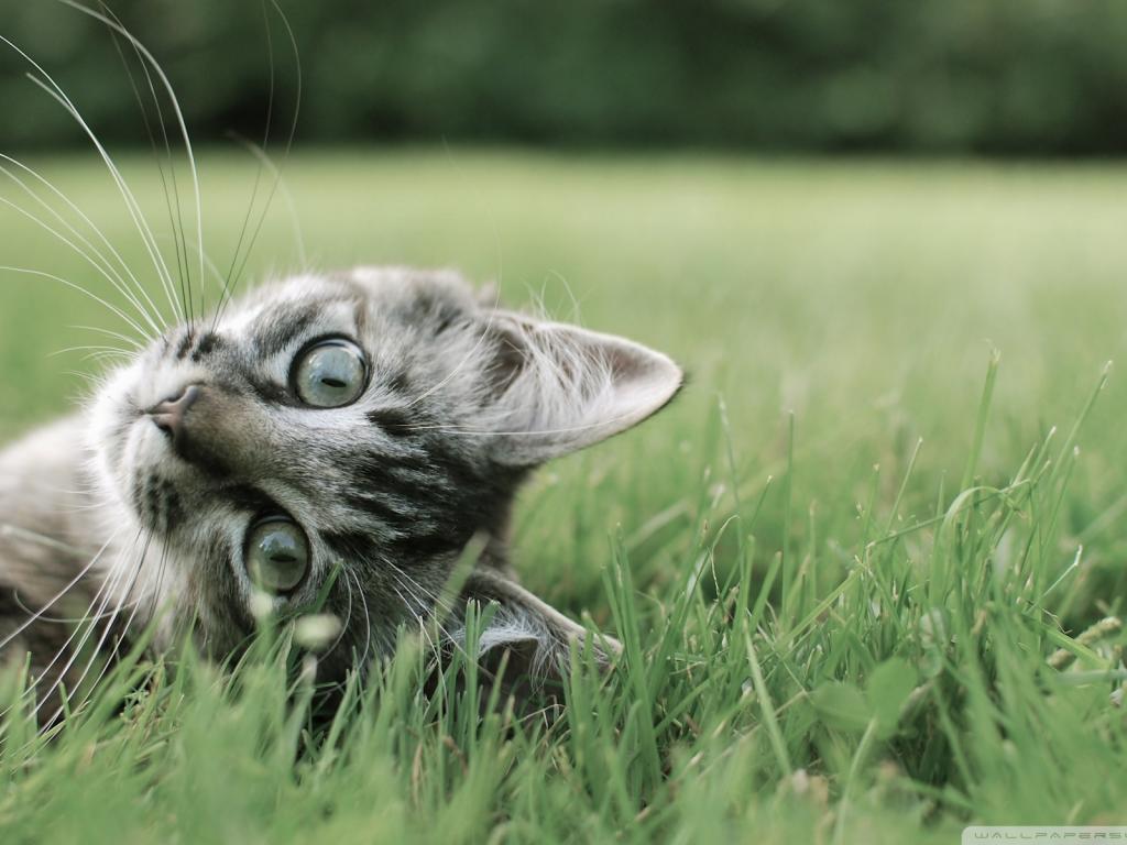 Серый котик в траве обои для рабочего стола, картинки, фото, 1024x768. | ||||||||||||||||