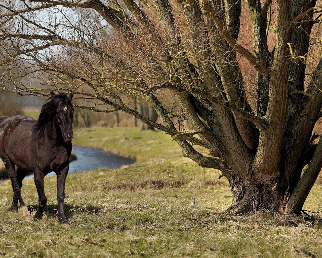 Черный скакун у реки, графия черной лошади в дикой природе. обои для рабочего стола, картинки, фото, 1280x1024. | ||||||||||||||||||||||