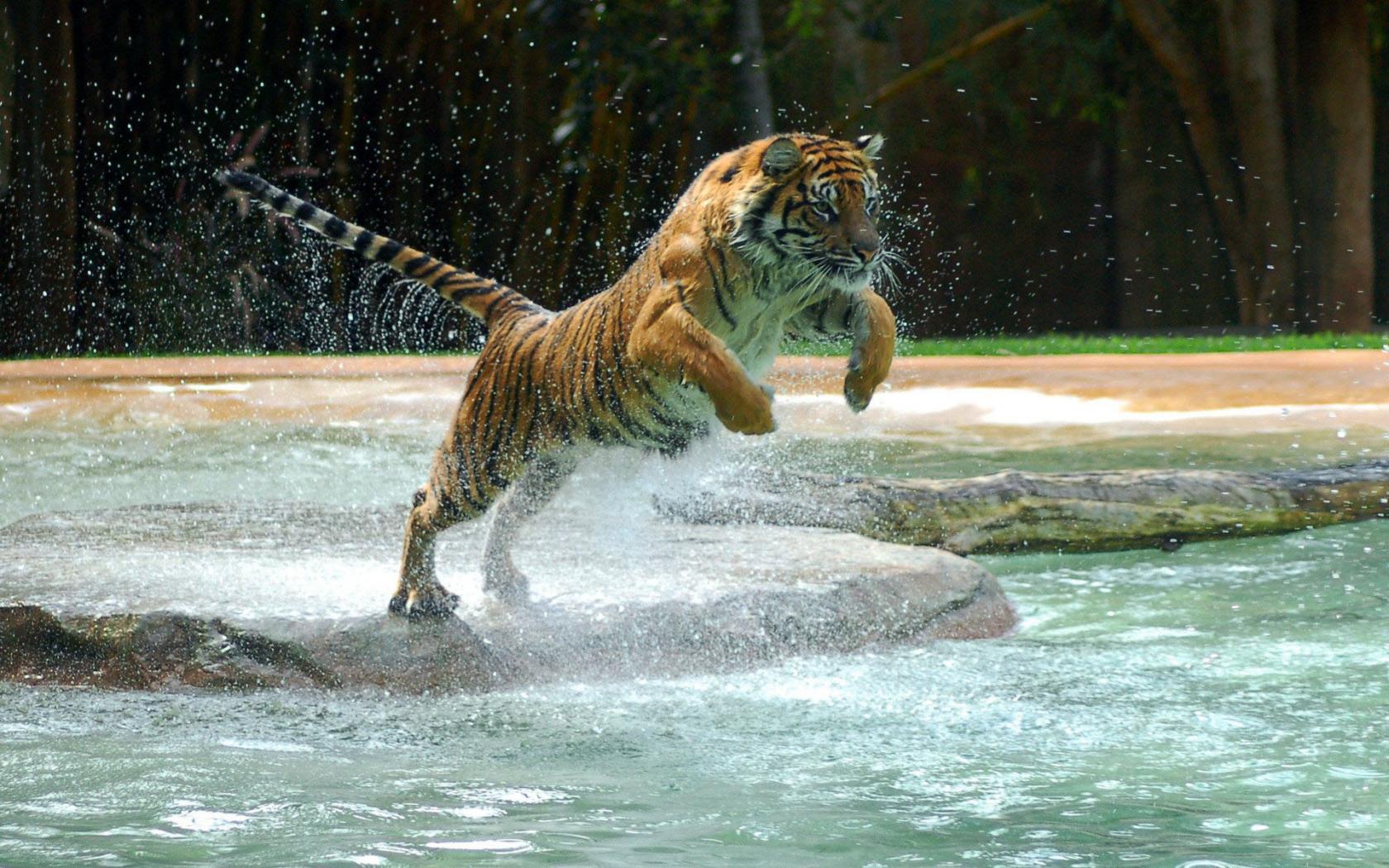 Тигр, прижок, вода, брызги обои для рабочего стола, картинки, фото, 1680x1050. | ||||||||||||||||