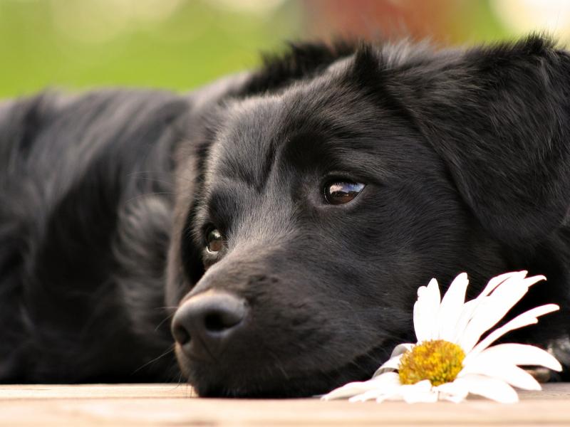 Черной собаки с цветком ромашки обои для рабочего стола, картинки, фото, 800x600. | |||||||||||||||||