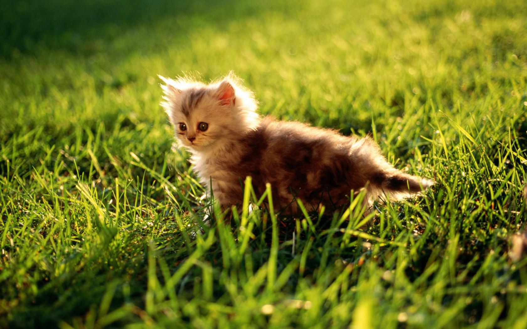 Маленький котенок прогуливается по зеленому лугу - обои для рабочего стола, картинки, фото, 1680x1050. | ||||||||||||||||||||||