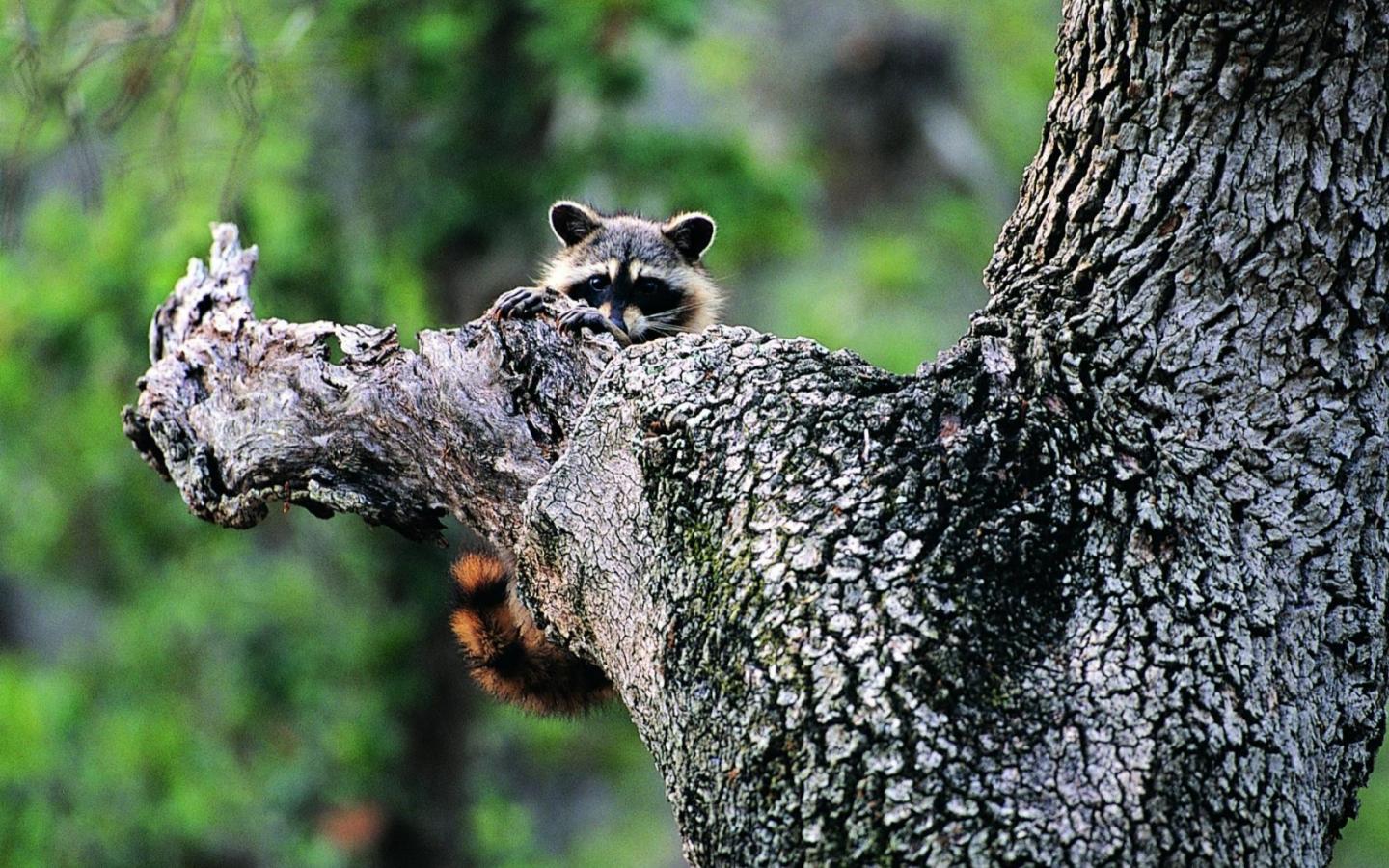 Енот-полоскун висит на дереве и смотрит в камеру обои для рабочего стола, картинки, фото, 1440x900. | |||||||||||||||||