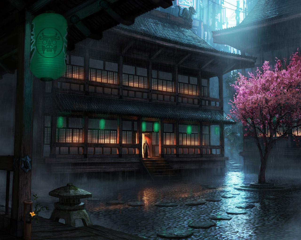 Дождь, дома, сакура обои для рабочего стола, картинки, фото, 1280x1024. | ||||||||||||||||