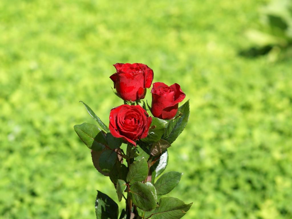 Три алые розы с зеленой травой на фоне обои для рабочего стола, картинки, фото, 1024x768. | |||||||||||||||||||||||