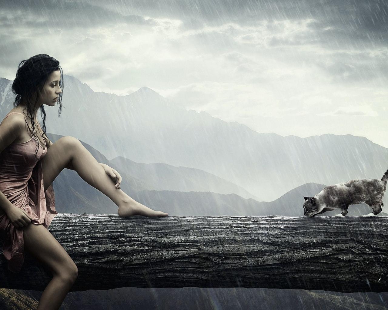 Девушка с кошкой на бревне обои для рабочего стола, картинки, фото, 1280x1024. | ||||||||||||||||