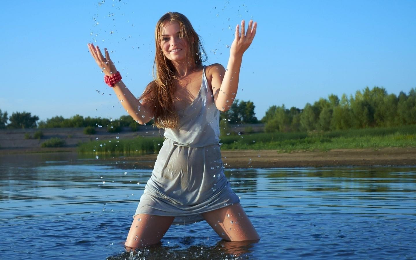 Девушка, озеро, брызги обои для рабочего стола, картинки, фото, 1440x900. | ||||||||||||||||