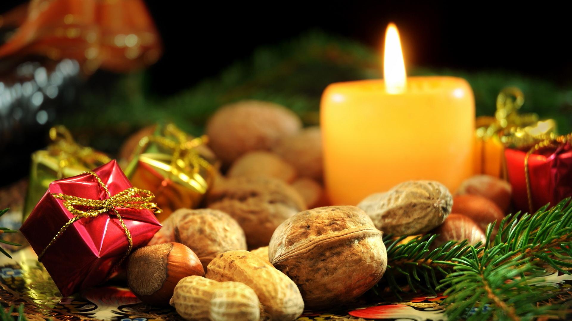 Свечи, украшения, орехи, хвоя, пламя, фокус обои для рабочего стола, картинки, фото, 1920x1080. | ||||||||||||||||||||||