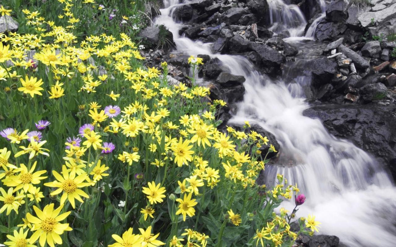 Горный ручей возле поляны цветов обои для рабочего стола, картинки, фото, 1280x800. | ||||||||||||||||||||||